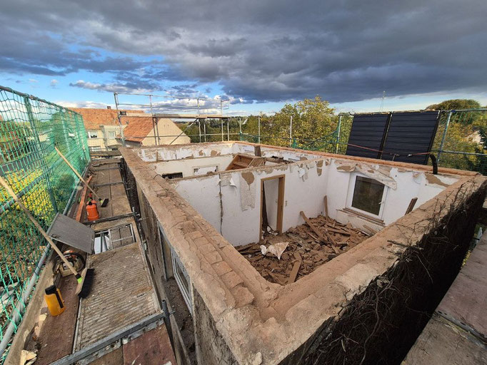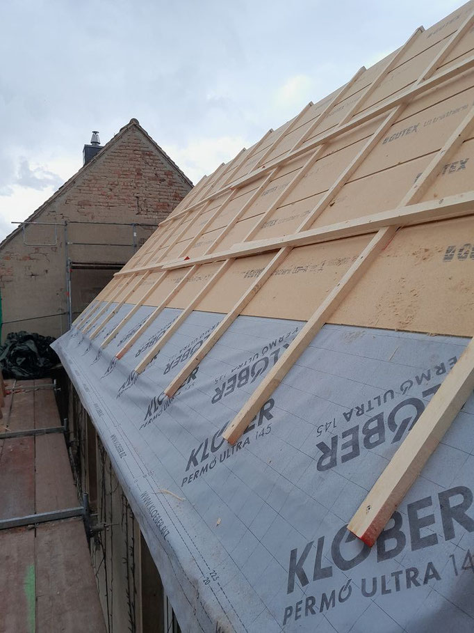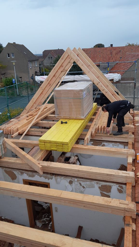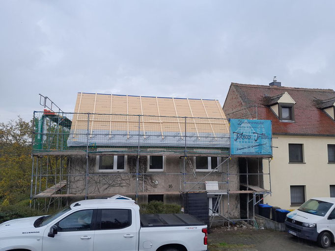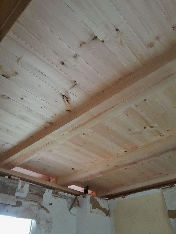 Kaum eine Woche verging, um dem Wohnhaus nicht nur einen neuen Dachstuhl, sondern eine klassische Sichtholzdecke und ein dichtes Dach zu verpassen.
