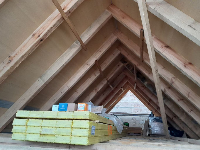 Das Dach wird mit einer Dämmschicht aus Holzfaserplatten sowie Einblasdämmung ausgestattet- Bestwerte nicht nur beim Dämmwert, sondern auch beim Schall- und sommerlichen Wärmeschutz.